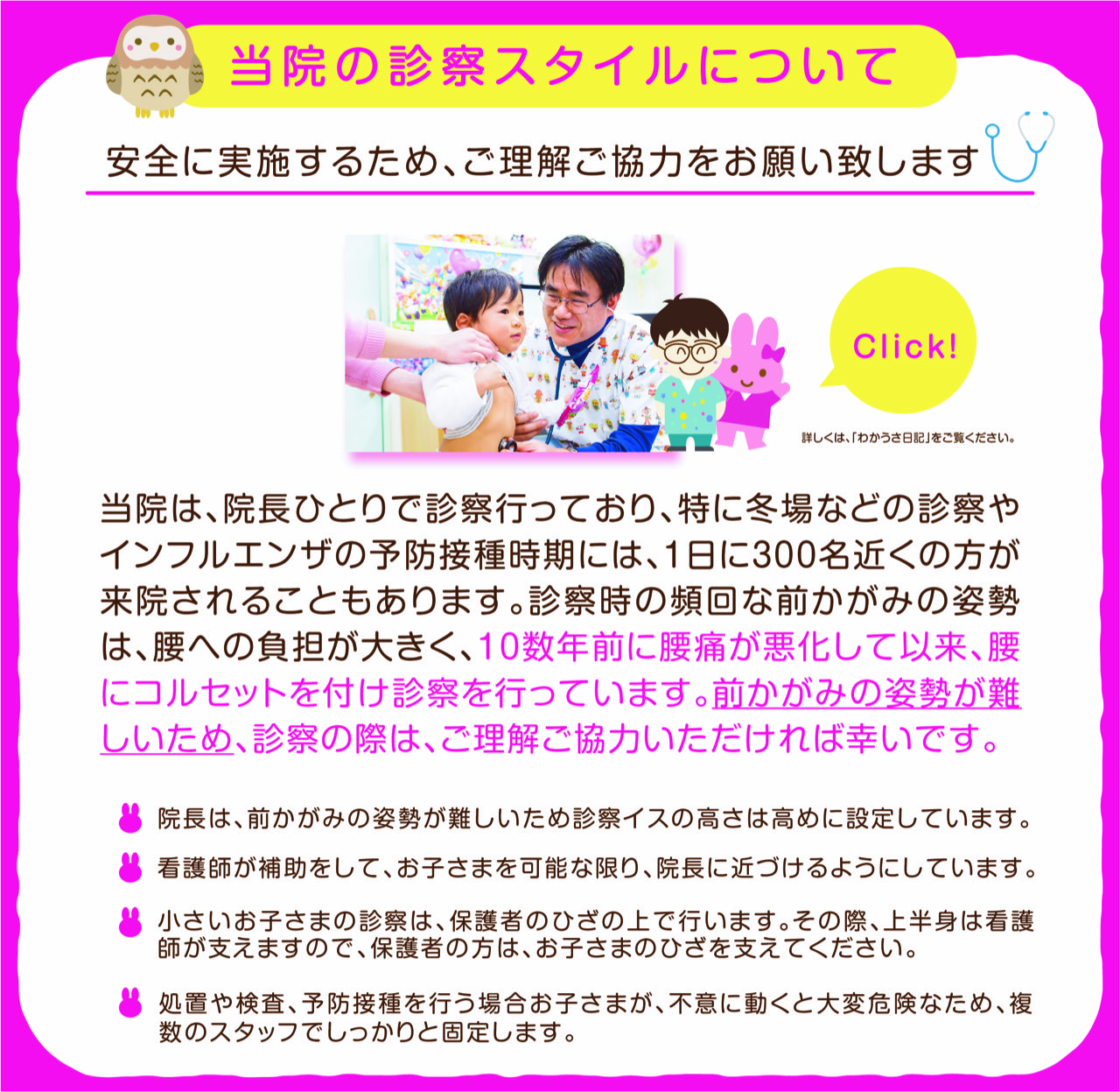 院長は腰痛があるため、診察スタイルに特徴があります。
